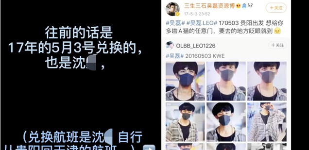 需要注意的是,在该视频中,客服曝出吴磊账号的多个兑换地址均与微博名为“三生三石吴磊资源博”的博主行程一致,如客服表示吴磊账号2017年5月3日为受让人沈某兑换了从贵阳前往天津的机票,而该博主的微博截图中,2017年5月3日正在“从贵阳出发”。