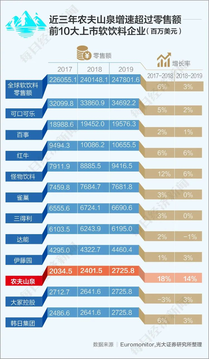 根据弗若斯特沙利文的报告,同期(2017-2018;2018-2019)公司收益增速远远高于同期中国软饮料行业5.0%及6.6%的增速以及全球软饮料行业2.7%及3.4%的增速。