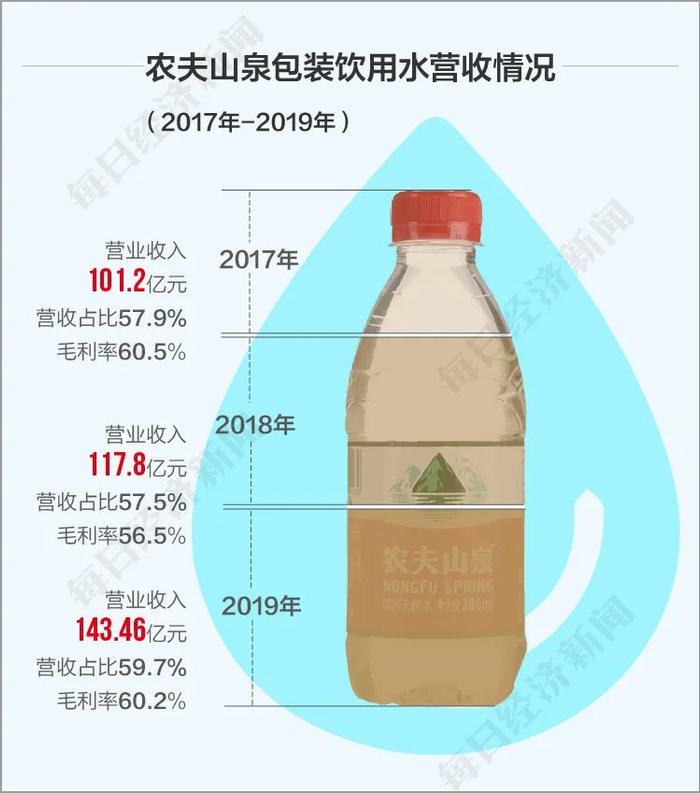 除了市占率高之外,农夫山泉增长更快,2017年至2019年,农夫山泉的收入分别为174.91亿元、204.75亿元和240.21亿元,年复合增长率为17.2%;净利润分别为33.86亿元、36.12亿元和49.54亿元,净利润率分别为19.4%、17.6%及20.6%。