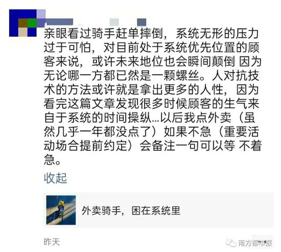 还文章指出,在系统的压迫下,外卖骑手受到派送时间不合理、规划路线含逆行、商家出餐慢、超时高额罚款等问题的多重折磨,为了不被系统除名、不影响站点数据,骑手们不得不选择铤而走险,每天都在违反交规、与死神赛跑,外卖员成了高危职业。有外卖骑手如此形容自己的职业:“送外卖就是与死神赛跑,和交警较劲,和红灯做朋友。”