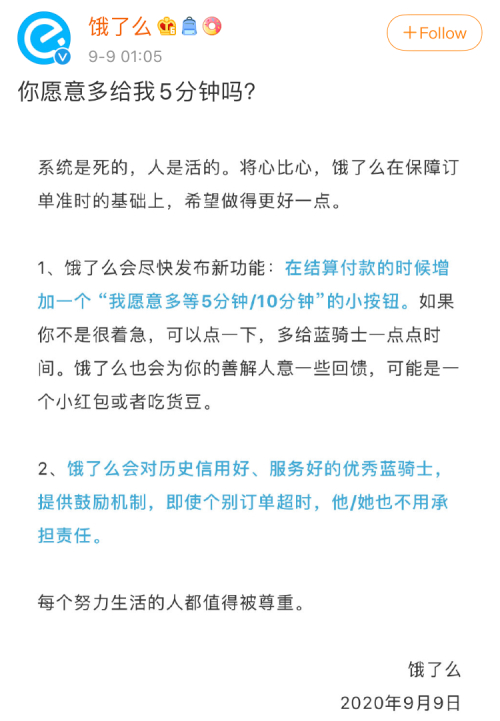 9日凌晨,饿了么率先发声,一篇《你愿意多给我5分钟吗?》的声明。