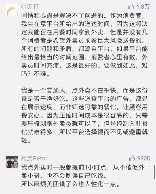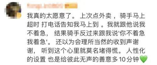 该文评论区中点赞量前4的评论,均大致上表达了同一层意思:自己愿意给骑手多一点时间上的宽容,希望平台也可以这么做。