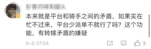 9月9日,饿了么有关负责人表示,官方发布新功能是自主选择的,主要考虑是想给那些不着急的用户,愿意多等待一会儿的用户一个选择权。对于这些用户给到的宽容,我们平台也会给用户回馈,以示用户对骑手理解的感谢。