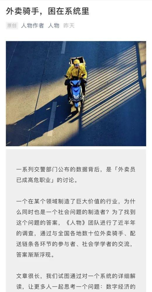 8日,《人物》刊发报道《外卖骑手,困在系统里》。报道反映了外卖平台算法系统和骑手实际工作的大量冲突,引发全网关注。