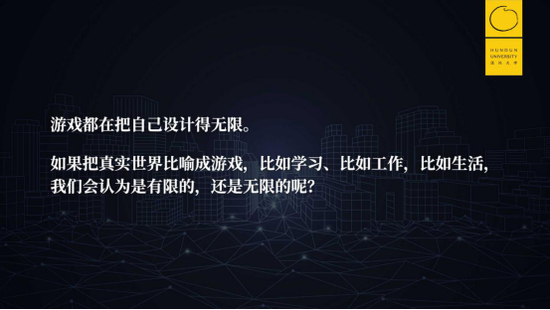 这就引出了我们的问题。游戏都会尽量设计得无限,来模拟我们的人生;那么反过来,如果我们把真实的生活比喻成游戏,有的时候反倒会陷入一个误区,认为人生是一个有限的东西。比如我们的学习、工作、生活,很多人可能会误认为是有限的,而不是无限的。这其实是我今天想说的一个脉络。