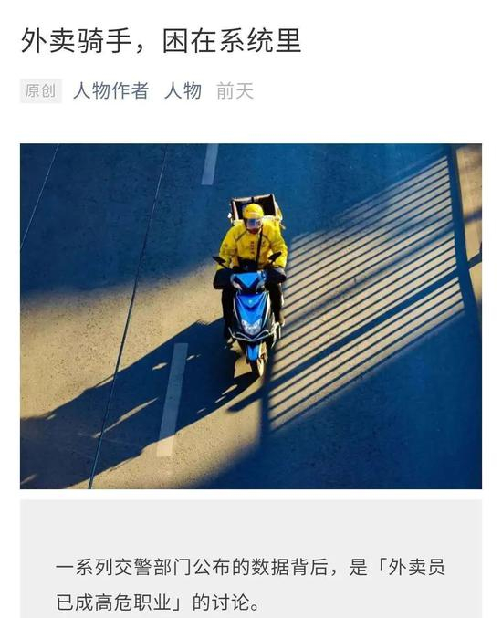 文章中,一位外卖骑手这样形容自己的工作——“送外卖就是与死神赛跑,和交警较劲,和红灯做朋友。”外卖骑手与“高危职业”划上了等号,微博上#外卖行业如何成为高危职业#的话题有2.1亿阅读量,讨论量达到了4万条。