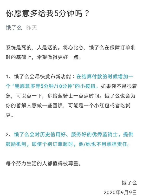 但在饿了么官方微博的评论中,多位用户提出了类似的疑问:为什么平台不考虑优化系统、修改规定以增加外卖骑手的配送时间,而是在呼吁用户做出让步、让用户买单?之后监管部门出面表示,饿了么的回应有违基本逻辑。