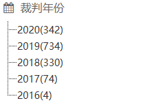 从年份来看,呈逐年大幅增长趋势,2016年仅为4份,2017年74份,2018年330份,2019年734份,2020年截至目前342份。