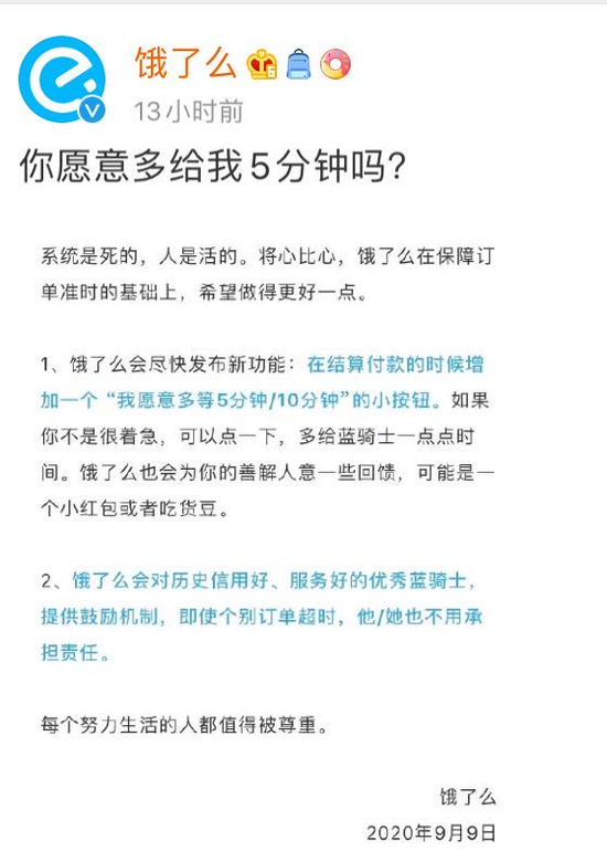 △9月9日,@饿了么 发布《你愿意多给我5分钟吗》,表示将推出“多等5分钟”功能。