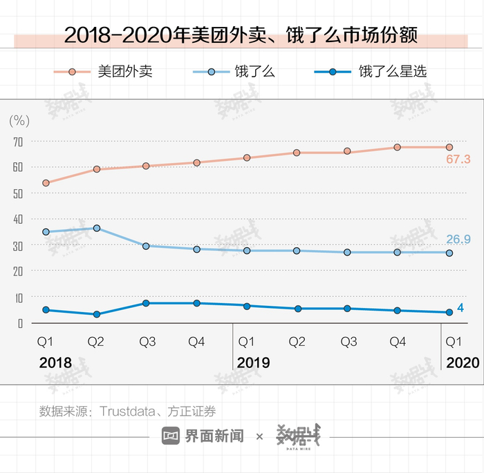 据Trustdata数据,截至2020年第二季度,美团外卖、饿了么两家已包揽了外卖市场近95%的市场份额。