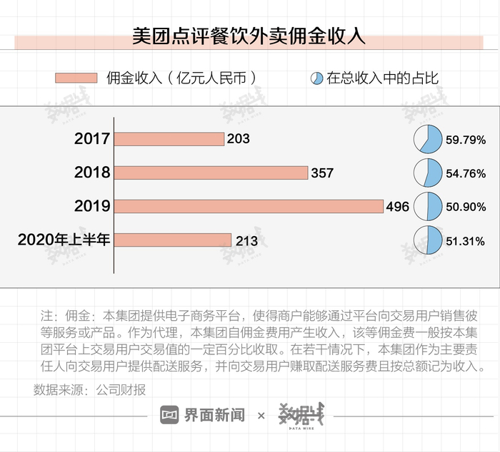 以美团点评为例,公司财报数据显示,2017-2019年,美团点评餐饮外卖佣金收入由202.84亿元增长至496.47亿元,3年增长了144.76%,在总收入中的占比基本维持在五成以上。