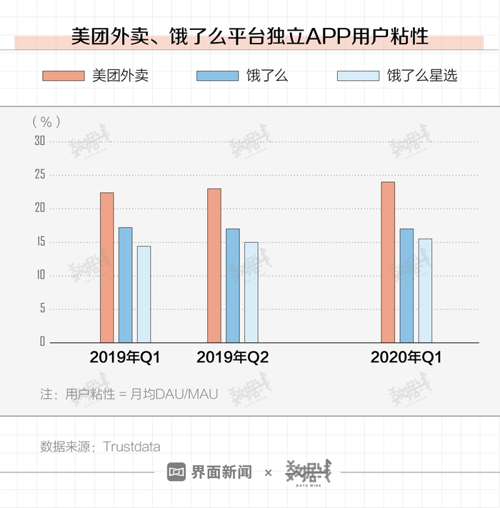 从用户粘性指标来看,截至2020年第一季度,美团外卖、饿了么的用户粘性均达到15%以上。其中,美团外卖24%的用户粘性,比去年同期多出1.6个百分点。粘性指标越高,意味着用户的依赖感、再消费期望数值越高。