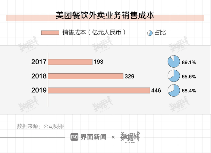 公司财报显示,截至2019年,美团餐饮外卖业务销售成本约446.1亿元,同比增加35.7%。据该财报,在解释2019年餐饮外卖销售成本增加时称,主要由配送订单量增加而令餐饮外卖骑手成本增加。