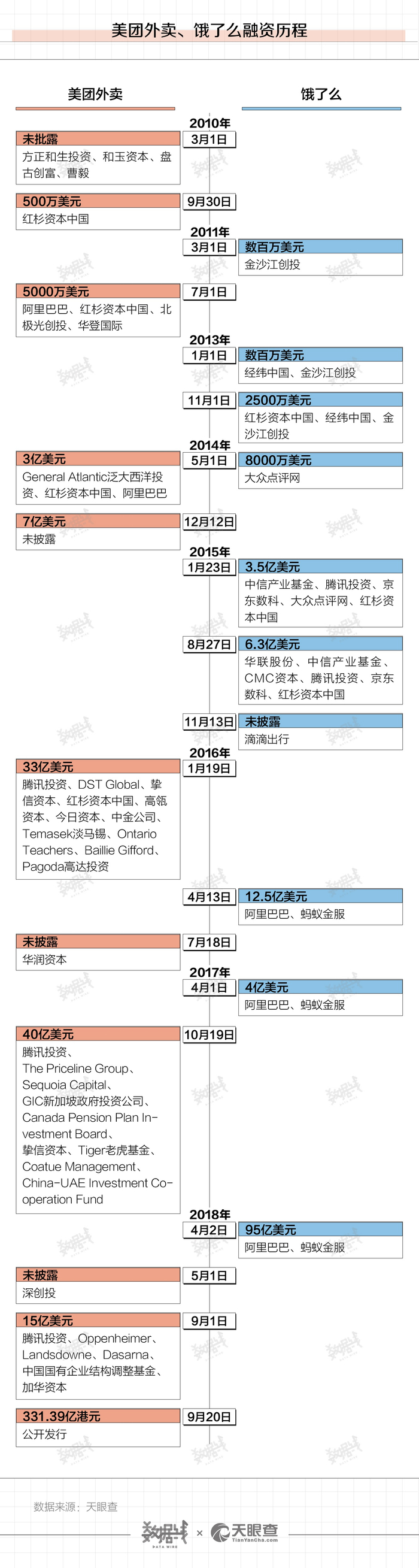 从2009年饿了么成立,到近年来互联网巨头们相继入场,在外卖行业,双头垄断格局逐渐形成,并在资本市场上多有较量。据天眼查数据,截至2020年9月10日,2010年至今,美团外卖和饿了么共计发生了21起融资事件。其中,金额最大的一笔发生在2018年4月2日,饿了么被阿里巴巴、蚂蚁金服以95亿美元并购。