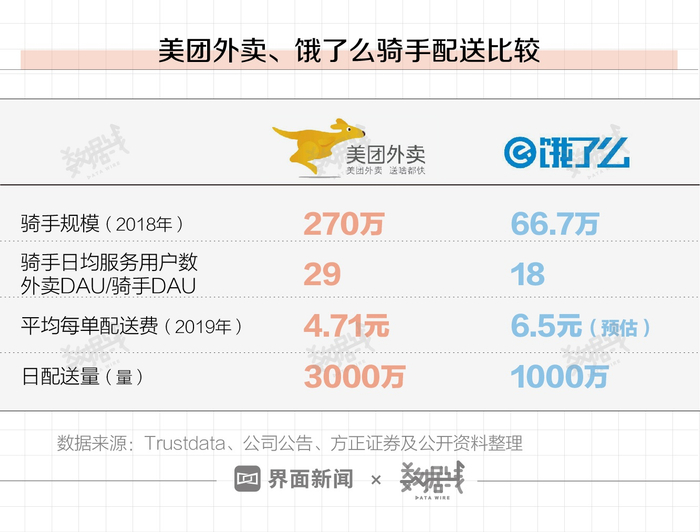 从配送端来看,据方正证券分析,美团外卖、饿了么两家日配送量共计4000万。对比美团,饿了么骑手规模偏少,每单配送成本偏高。
