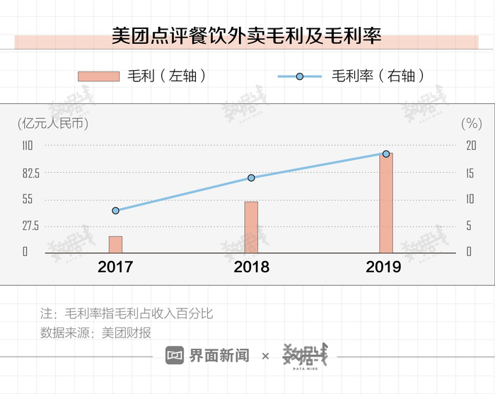 在毛利方面,2017-2019年,美团点评餐饮外卖毛利由16.99亿元增长至102.33亿元,三年增长了5倍多。