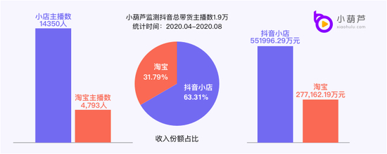 第三方数据监测平台小葫芦大数据显示,抖音带货TOP 100主播来自淘宝渠道的带货销售额约为14.6亿,抖音销售额近9亿,但同时期,抖音小店的主播数为14350个,收入占比为63.31%,商品来自淘宝的主播仅为4793,收入占比为31.79%。