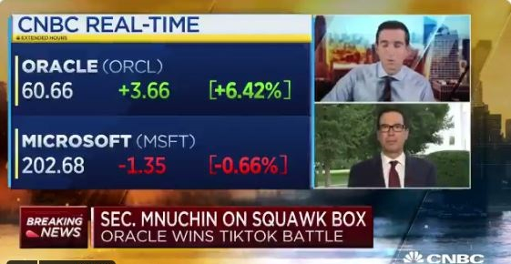 此外,姆努钦还在CNBC上确认,甲骨文公司已提议成为TikTok受信任的技术伙伴。“这会创造一个总部位于美国的公司,并带来20000个新岗位。美国外资投资委员会(CFIUS)将会在本周审查这份提议,并推荐给特朗普。”