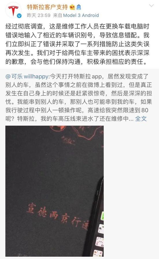 15日23时59分,微博认证为“特斯拉汽车(北京)有限公司”的账号@特斯拉客户支持转发金先生的微博并表示:“经过彻底调查,这是维修工作人员在更换车载电脑时错误地输入了相近的车辆识别号,导致信息错配。”