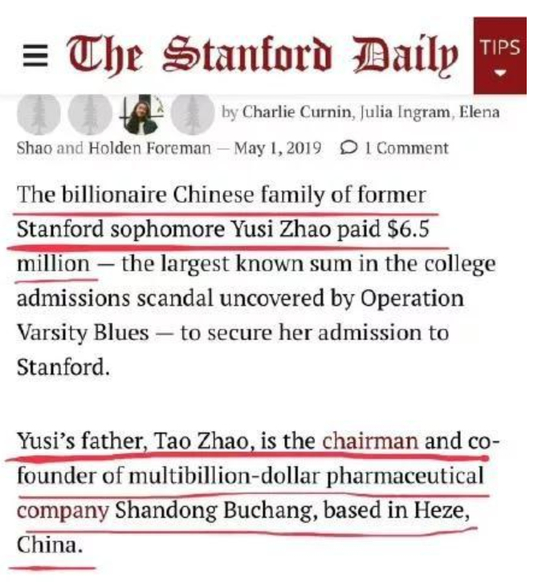 2019年5月,步长制药董事长赵涛向升学顾问威廉·辛格支付了650万美元,使其女儿Yusi Zhao在2017年以帆船选手的身份被斯坦福大学录取。