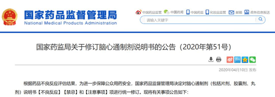 如果真是有益无害的药品,病人吃了也没什么,然而今年4月10日,国家药监局发布公告,要求对脑心通制剂(包括片剂、胶囊剂、丸剂)说明书【不良反应】【禁忌】和【注意事项】项进行统一修订。