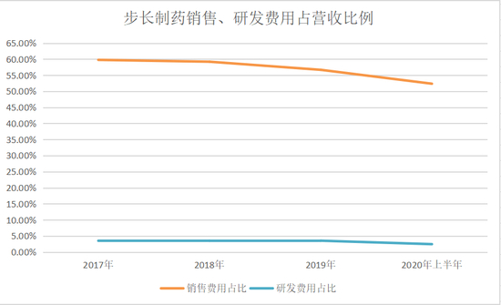 另一方面,与营收占比超过50%的销售费相比,步长制药的研发费一直从未超过5%。2020年上半年,公司研发费用不足1.8亿,销售费用是当期研发费用的21倍。