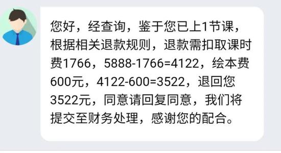 “9月12日交了5888元,9月13日,孩子上课发现,老师上课有明显的口音,并且只是照着课件念,孩子不喜欢,当天我就打电话申请退费。”杨月说,9月15日,客服声称要扣除30%的课程费用,并且还要扣除600元的绘本费,共计2336元。
