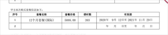 记者了解到,杨月购买的是阿卡索12个月套餐(国际),共393课时,时间跨度为2020年9月12日至2021年11月29日。
