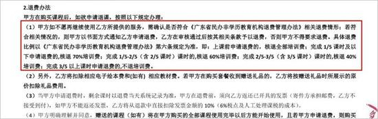 而按照《广东省民办非学历教育机构退费管理办法》第六条规定:完成1/5学时及以下的,核退70%学费、住宿费;完成1/5--2/5(含2/5学时)学时的,核退60%学费、住宿费;完成2/5—3/5(含3/5学时)学时退学的,核退40%的学费、住宿费;完成3/5以上学时退学的,不退学费、住宿费。