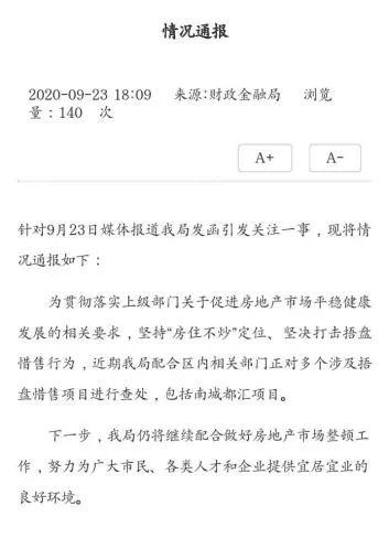 通报说,为贯彻落实上级部门关于促进房地产市场平稳健康发展的相关要求,坚持“房住不炒”定位、坚决打击捂盘惜售行为,近期我局配合区内相关部门正对多个涉及捂盘惜售项目进行查处,包括南城都汇项目。
