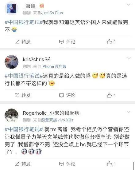 抱怨本次中行笔试题目难的,远不止上面这一位考生。