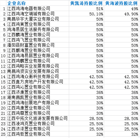 以起家的家电来看,江西鸿海电器有限公司(简称“鸿海电器”),黄凯涛持股51%,黄海波持股49%;“买断房产”模式的南昌华宇大厦实业有限公司,黄凯涛持股50%,黄海波持股50%;江西鸿海易居置业有限公司(简称“鸿海易居置业”),黄凯涛持股50%,黄海波持股50%。