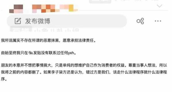 值得注意的是,在李子柒品牌官方微博声明发布当天,爆料人火速发文回应称“我所说属实不存在所谓的恶意抹黑,愿意承担法律责任”,“如果李子柒方还是认为,错过方是我们,该走什么法律程序就什么法律程序”,另该爆料人称基于对其朋友的本意是“不想把事情搞大,只是单纯的想维护自己作为消费者的权益”,其删除了原本爆料内容。