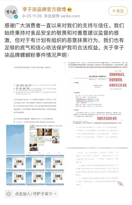 在声明中,李子柒方还提供了一份“李子柒品牌螺蛳粉刀片事件”的传播链路,称“存在大量有预谋的有领导痕迹的无底线抹黑,对品牌名誉或造成严重负面影响”,并表示已向公安机关报警并向相关人员及机构发出律师函。