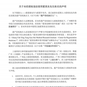 对此,《声明》强调,已故霍英东先生的家属(包括但不限于遗产信托执行人)与上述公司以及中医城项目、中医城合作项目概无任何关系。已故霍英东先生的家属(包括但不限于遗产信托执行人)并未参与或授权任何单位或个人参与中医城项目和中医城合作项目,也从未授权广州鹤年堂中医门诊部有限公司及上述主体使用已故霍英东先生的姓名。