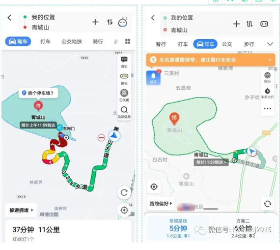 可以看出的是,高德用时31分钟的路程,百度仅用5分钟。且如果按照高德的导航驾车前往,会导入一个封闭多年的老路。正是因为这样,导致了国庆期间该景区的严重拥堵。