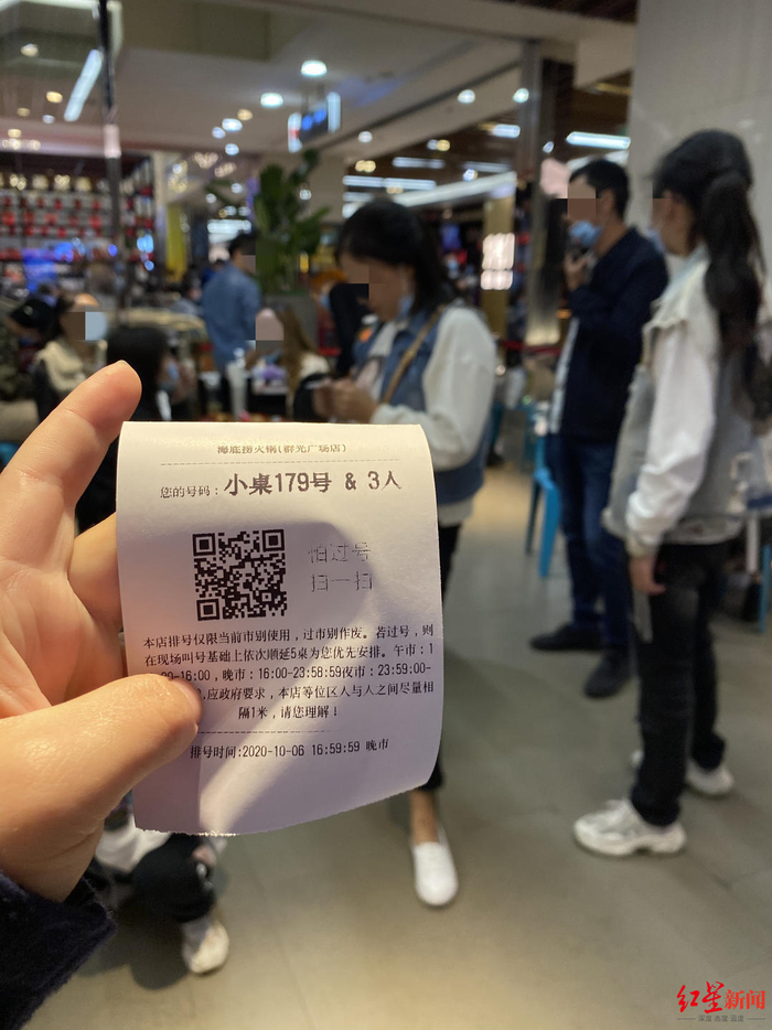 10月6日晚,红星新闻记者到达海底捞火锅成都群光广场店后,现场取号为小桌179号,工作人员告知大约需等待3个小时;但在记者花费40元购买插队服务后几分钟,客服人员表示已安排好小桌41号,并让记者告诉服务员“手机尾号1474,我们预约好的小桌41”即可。由179号变41号,不到15分钟,红星新闻记者便被顺利叫号,等餐时间缩短了两个多小时。