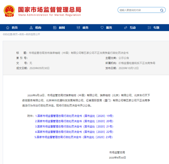 2020年9月18日,市场监管总局对瑞幸咖啡(中国)有限公司、瑞幸咖啡(北京)有限公司、北京车行天下咨询服务有限公司、北京神州优通科技发展有限公司、征者国际贸易(厦门)有限公司等五家公司不正当竞争违法行为作出行政处罚决定。现将行政处罚决定书予以公告。