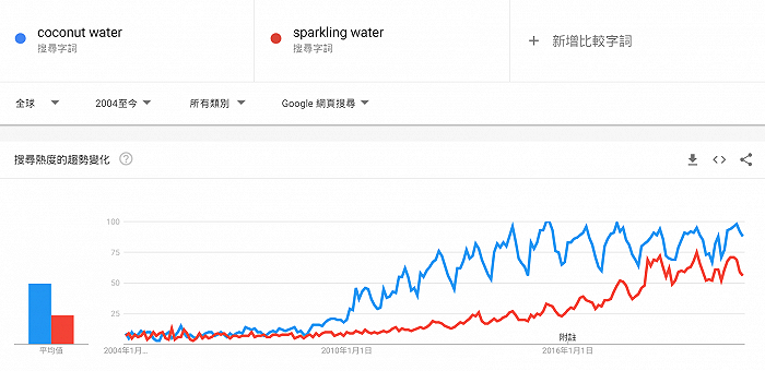 Google Trends显示,椰子水的全球搜索热度多年来未见上涨