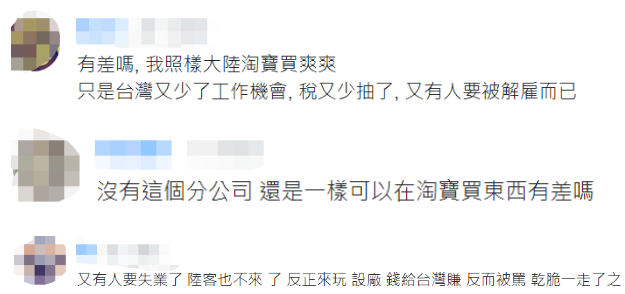 对此,有岛内网友称对自己并没有影响,因为可以照样在大陆淘宝买东西,只是台湾又少了工作机会。↓