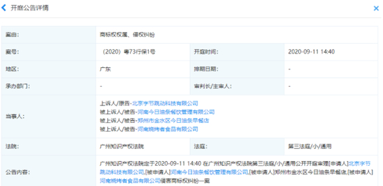 据启信宝显示,目前,该案于9月11日在广州知识产权法院公开开庭审理。北京字节跳动科技有限公司对此申请行为保全(案由为商标权权属、侵权纠纷),被告方为河南今日油条餐饮管理有限公司、郑州市金水区今日油条早餐店、河南烧烤者食品有限公司。