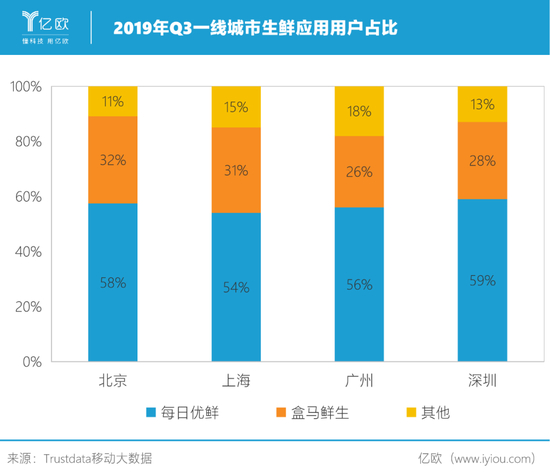 《2019年1-9月中国移动互联网行业分析报告》显示,生鲜电商在一线城市已呈现“631”格局。在2019年Q3,一线城市生鲜用户占比中每日优鲜占总人数60%左右,盒马APP占比30%左右,永辉生活APP甚至没有跻身前十。