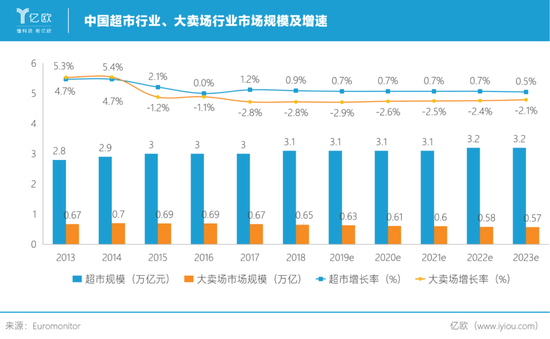 根据Euromonitor,2018年超市行业(包含大卖场、综超、便利店)总规模3.1万亿元,未来五年无明显增长变化;其中,大卖场行业总规模约6500亿元,同比-2.8%。