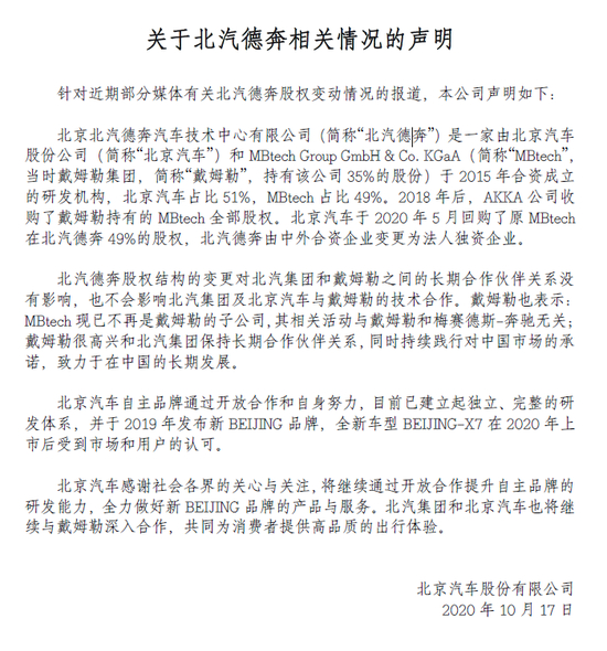 2020年10月17日,北京汽车股份有限公司(简称“北汽股份”)针对北汽德奔股比变动一事发表相关声明表示,北汽德奔股权结构变更对北汽集团和戴姆勒之间的长期合作伙伴关系没有影响,也不会影响北汽集团及北京汽车与戴姆勒的技术合作。