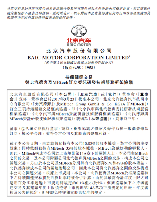 至此,戴姆勒与MBtech已不再有关系。只是,令人费解的是,就在戴姆勒宣布出售完MBtech剩余股份前一年,北京汽车、北汽德奔和MBtech于2017年3月签订了三项为期三年的持续关联交易框架协议,三份协议内容都是与委托研发技术服务有关,三份协议的委托方与受托方分别是北京汽车与北汽德奔、北京汽车与MBtech、北汽德奔与MBtech。