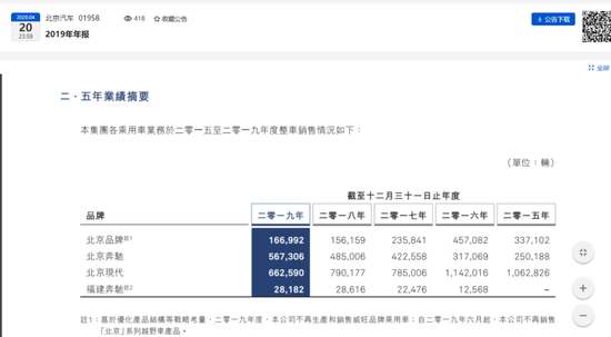 (北京汽车2019年年报显示的历年自主品牌年销量)