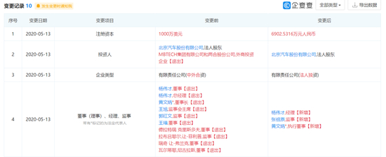 北汽与德奔“拆伙”, 事件起因是2020年5月,原持股北汽德奔49%的MBtech Group GmbH & Co. KGaA(梅赛德斯-奔驰技术集团,以下简称“MBtech”,原是戴姆勒集团子公司,后于2018年被出售给Akka Technologies SA)从股东位置上退出,而原持股北汽德奔51%的北汽股份变为100%持股;企业类型从中外合资变为法人独资;担任董事、监事的外方高管退出。