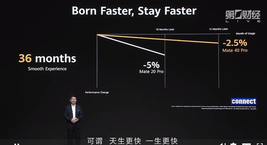 余承东表示,四年前华为承诺华为手机可使用18个月不卡顿,而现在可以达到36个月不卡顿。他给出的数据是,华为Mate 40 Pro使用36个月后流畅性只比最开始下降2.5%。