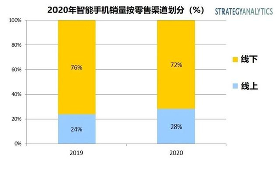 在Strategy Analytics最新发布的研究报告中指出,智能手机在线零售渠道销量将在2020年全球智能手机总销量中占据创纪录的28%,比2019年的24%猛增4个百分点。疫情让手机厂商的分销开始更多的转移到线上。