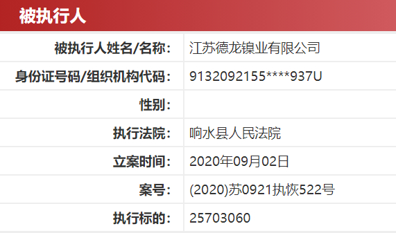 记者注意到,德龙镍业曾于今年9月被法院列为被执行人,案号(2020)苏0921执恢522号,执行标的为25703060。10月29日,记者再次查询最高法执行信息公开网,发现该则被执行信息已被撤下。